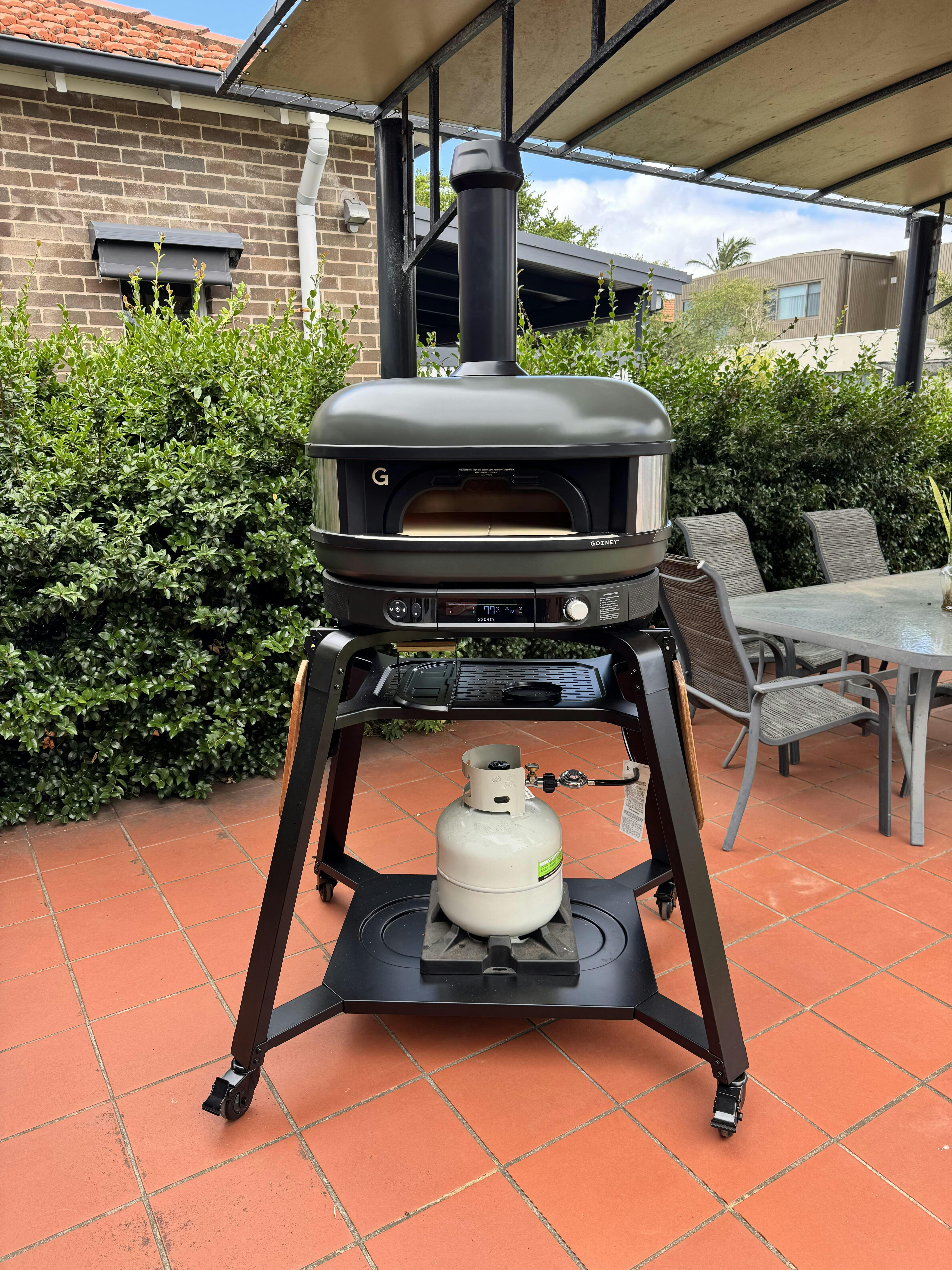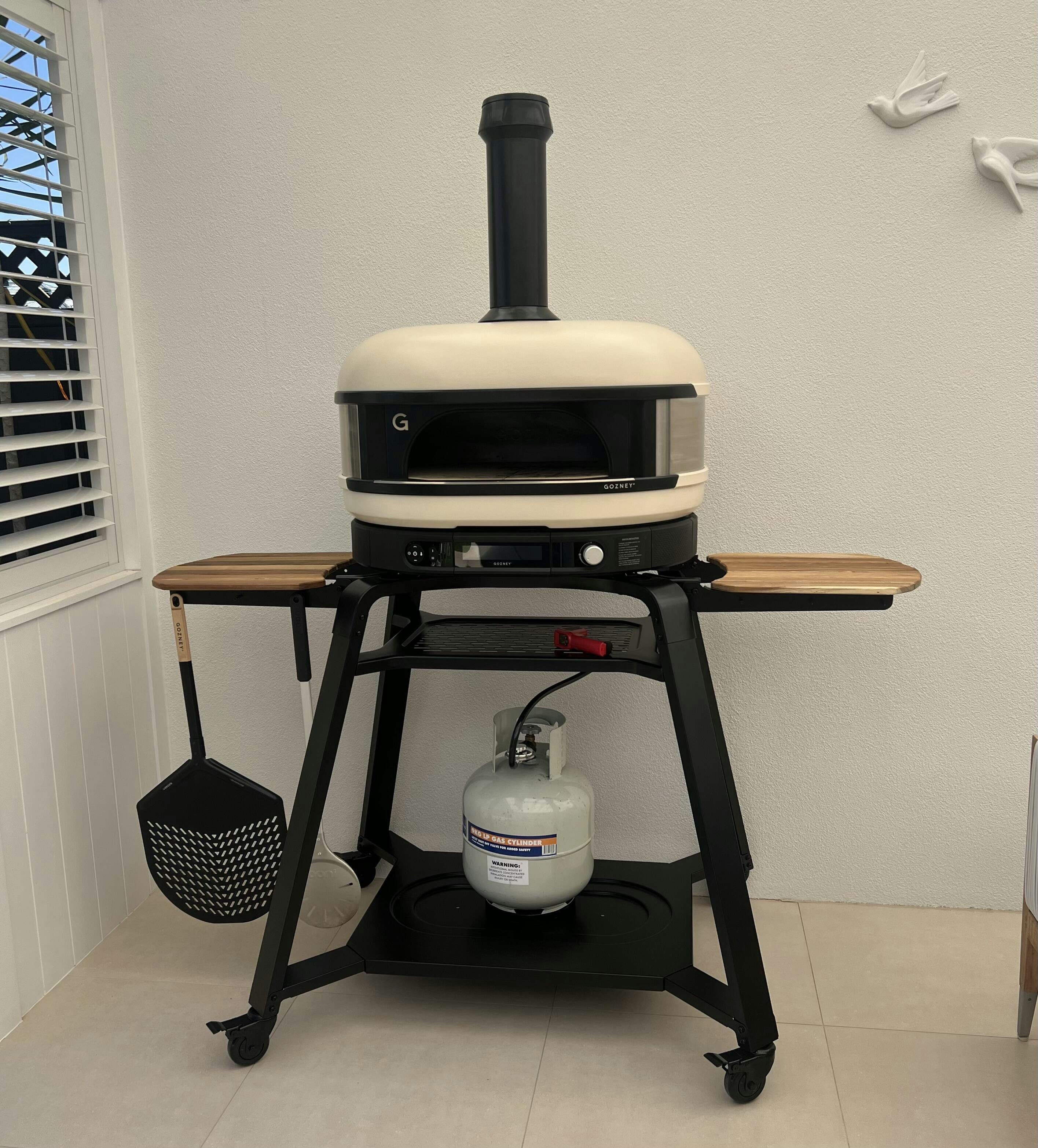 Your oven securely connects to the stand with an easy turn fastener and sits at the perfect height for cooking. The acacia shelves, pegs and adjustable wings are built in for convenience while the four large wheels make it easy to move your oven around your backyard.